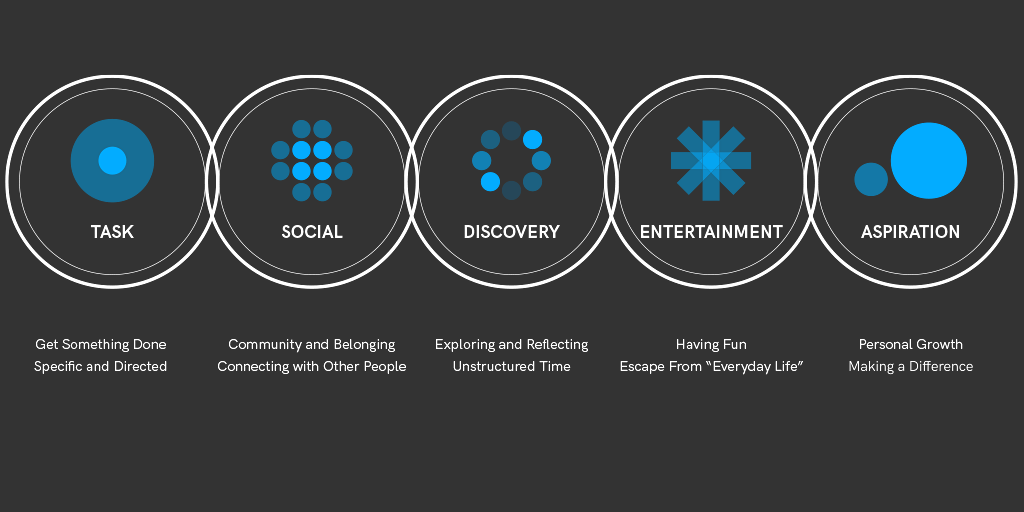 A fundamental element of designing for experience is understanding a person’s intention and how it frames their experience. Though there are myriad reasons people do what they do, our research identified five distinct categories, or “modes,” of experience.