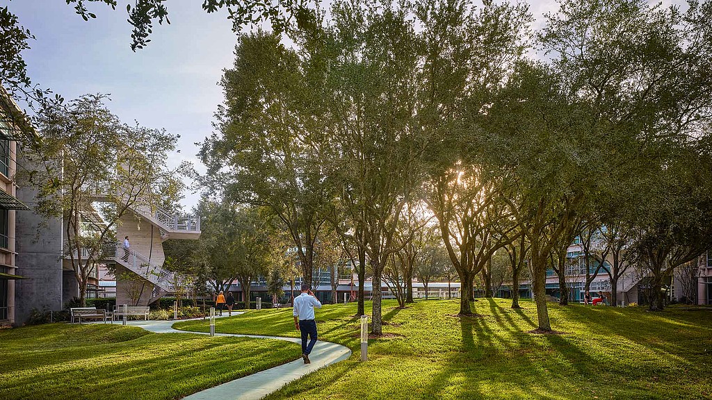 This client's revitalized Tampa campus transforms an outdated workplace to a new dynamic and collaborative environment that fosters innovation and promotes growth. The team conducted an analysis of global workplace design trends and simultaneous examination of the local program in order to transform the existing workplace culture in line with the client's values. The design balances neighborhoods with nearby support and collaboration areas, and color unites the entire space and establishes neighborhoods.