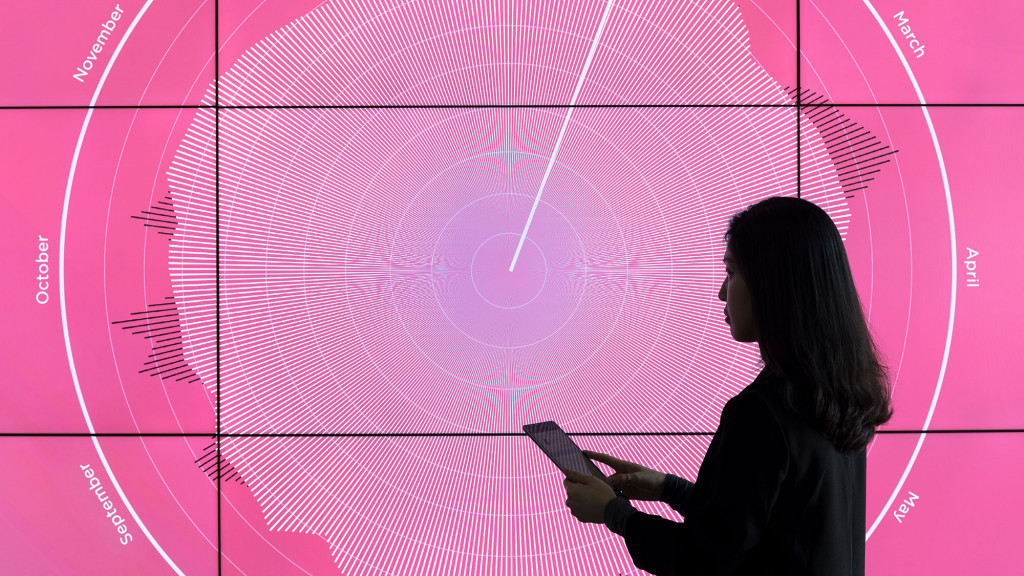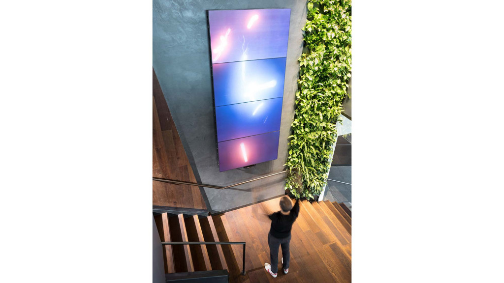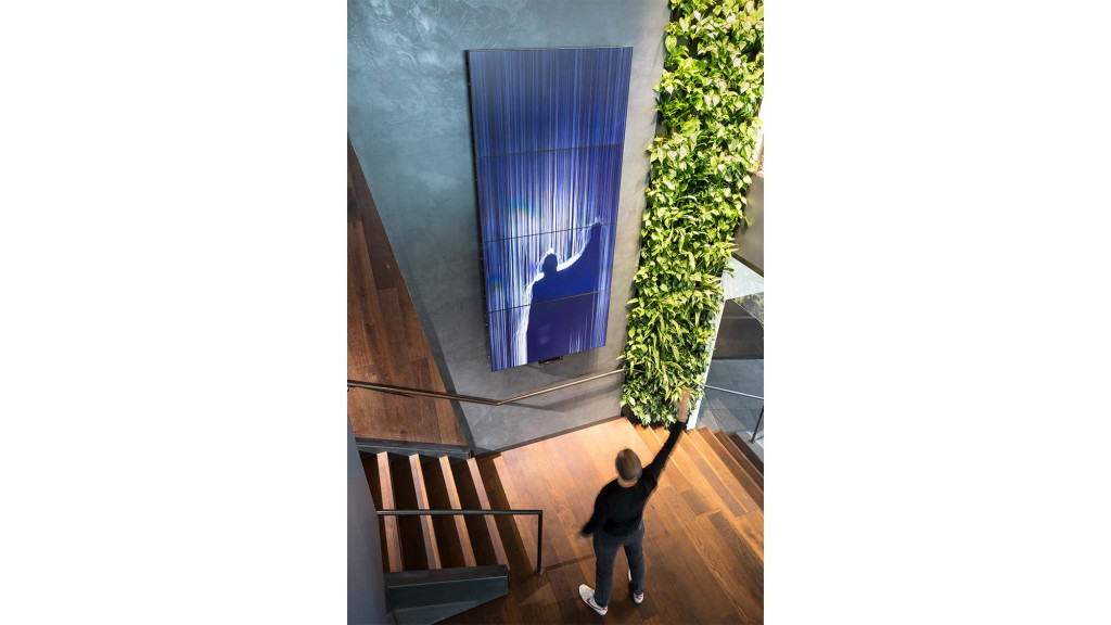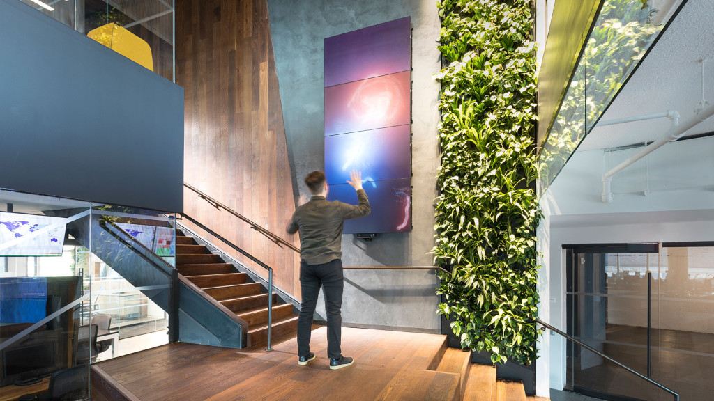 Delos, the creator of the WELL Building Standard focusing exclusively on human health and wellness, engaged Gensler to design its headquarters and a branded digital experience that illustrates its mission. Utilizing their own space as a method to visualize building sensor technology and data, Gensler crafted two digital experiences expressed in real-time visual renderings to educate and interact with guests and employees. At reception, circadian rhythm serves as the foundation of the platform. Case studies, a news feed, the Delos mission statement, and seven qualitative and quantitative data visualizations are emblazoned on a perennial background color that morphs throughout the day and year based on the position of the sun. In the stairwell, digital displays propel activity through the office with a layered interactive workplace experience that celebrates movement through three unique visual modes.