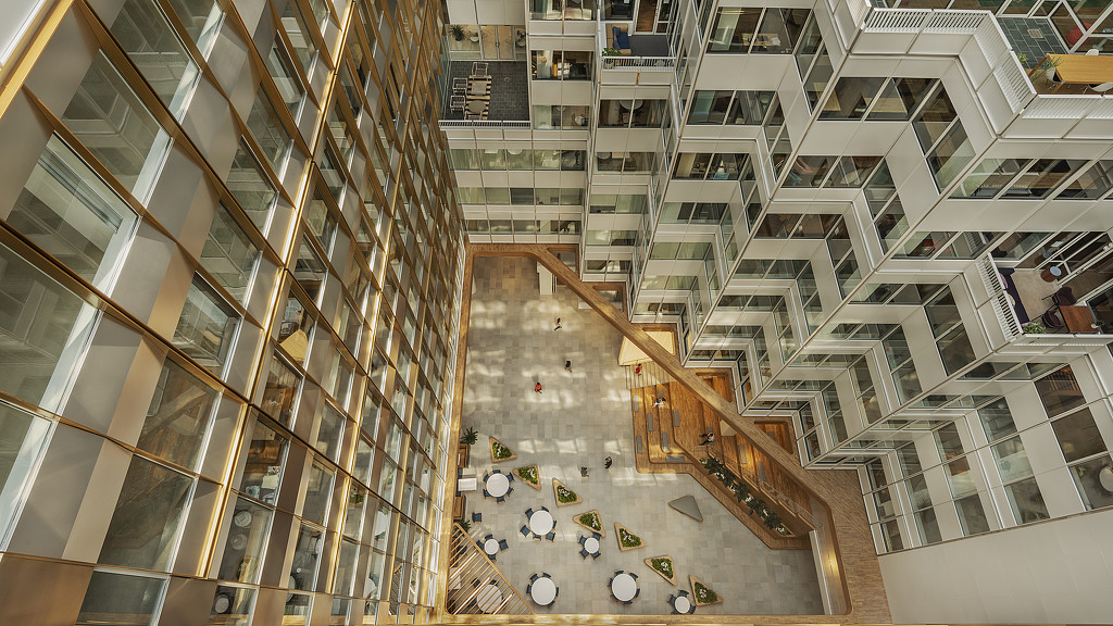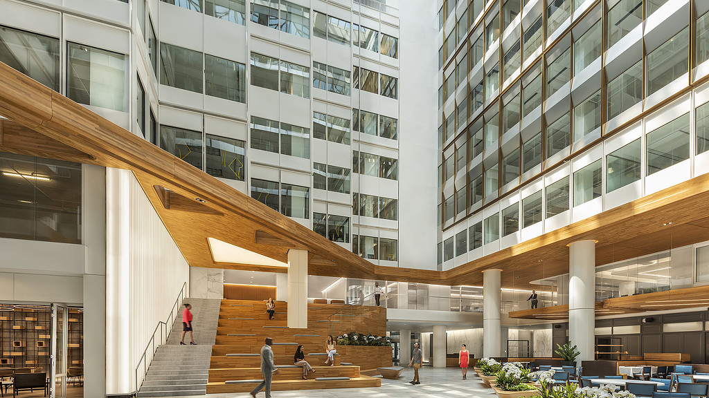 A dynamic reimagining of shared amenity space breathes fresh life and new relevance into a timeless D.C. office, retail, and restaurant location. Previously sitting at more than 20% vacant, owners Boston Properties engaged Gensler to design a top-to-bottom repositioning effort to attract new tenants to the venerated property. The most dramatic and impactful change is seen in the atrium, where a new, elegant experience connects amenities across two stories, filling and unifying the space vertically via a bold stadium stair that leads up to the new fitness center, marketing and spec suites, business center, and conference space. The atrium’s immense scale allows the architectural and interior design features to play off one another to create a spirited and welcoming destination spot for both visitors and tenants.